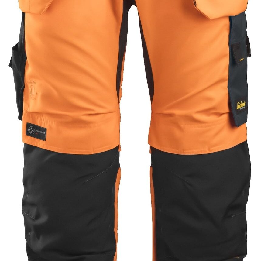 Snickers, High-Vis arbeidsbukse med hylsterlommer, velegnet for daglig bruk. CORDURA®-stretchkile sørger for god passform og bevegelighet.