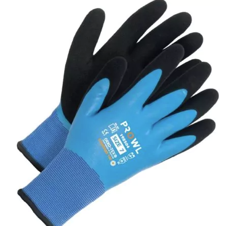 Prowl, dobbeldyppet håndflate i lateks og sand, strikket mansjett. Foret med akryl flanell. Godt grep.