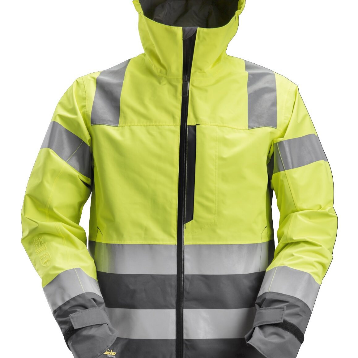 Snickers vanntett skalljakke med varmeforseglet refleks gir god synlighet i farlige arbeidsmiljøer. Fast hette.